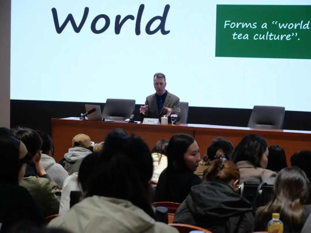 讲座现场,同学们专注聆听、积极互动。在探讨茶作为贯穿古今、连接东西方文化的载体,如何促进文明互鉴、增强文化认同方面,以及数智技术与传统文旅结合的具体案例时,引发了同学们的深入思考和热烈讨论。
